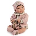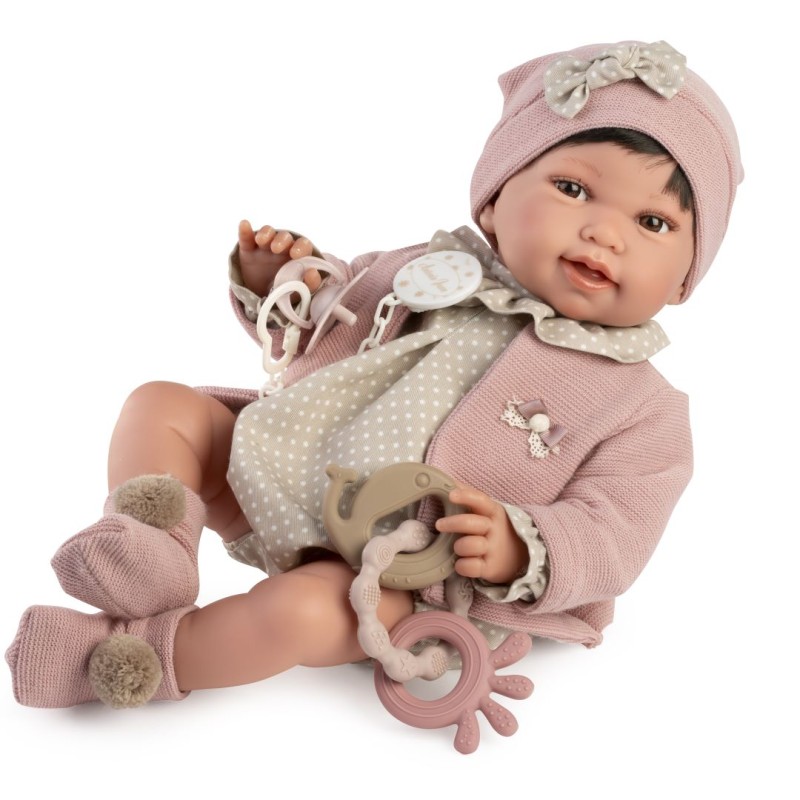Zależy Ci na tym, aby lalka dla dziewczynki była ubrana w piękne, stylowe i miłe w dotyku, ręcznie szyte ubranka? Recien Nacida Pipa urzeka modnym i gustownym strojem. Jasnobeżowe, bawełniane body w białe groszki jest wykończone ozdobnymi mankietami i kołnierzykiem z falbanką. Ciepły sweterek oraz czapeczka udekorowana kokardką zostały wykonane z wysokiej jakości dzianiny w kolorze pudrowego różu. Wygodne skarpetki z pluszowymi pomponami doskonale dopełniają zachwycający strój. Dodatkowo w komplecie znajdują się idealnie dopasowane akcesoria: smoczek na łańcuszku z klipsem w kształcie uroczego misia oraz gryzak w formie dziewczęcej bransoletki w pastelowych kolorach. Każdy element outfitu został zaprojektowany z największą dbałością o detale, co podkreśla najwyższą jakość i wyjątkowość zabawki.