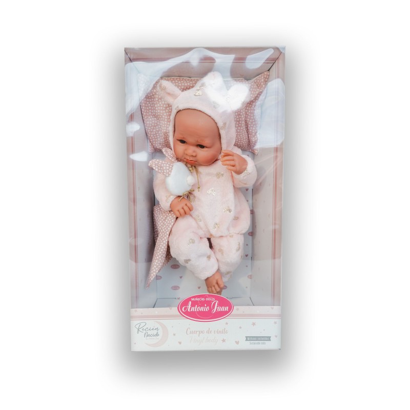 Jedyna w swoim rodzaju, oryginalna lalka hiszpańska Luca 50416 została w całości wykonana w Hiszpanii. Atrakcyjności zabawce dodaje miękka, brzoskwiniowa poduszka w serduszka oraz przytulanka w pasującej do outfitu bobasa kolorystyce. Oryginalne, designerskie opakowanie z wieczkiem może spełniać rolę opakowania prezentowego, a następnie łóżeczka dla bobasa. Lalki hiszpańskie Antonio Juan posiadają wszystkie wymagane certyfikaty bezpieczeństwa i nadają wyjątkowego charakteru każdej kolekcji zabawek.