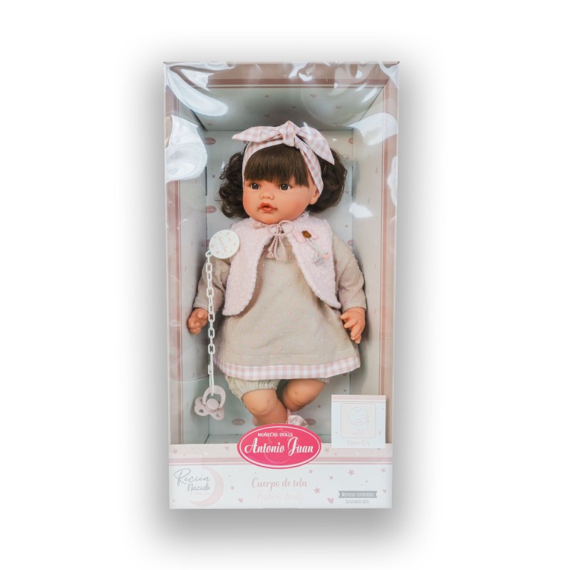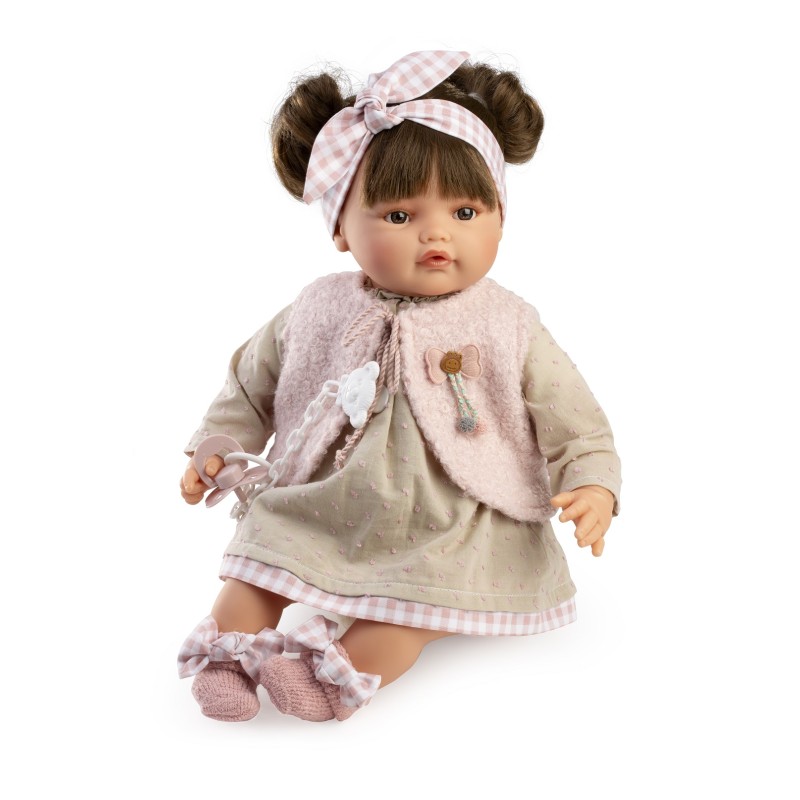 Przypominająca prawdziwe dziecko lalka hiszpańska 16382 ma stale otwarte, brązowe oczy o głębokim spojrzeniu, opatrzone długimi rzęsami i delikatnie namalowanymi brwiami. Miękkie w dotyku policzki zdobią rumieńce. Uroku dziewczynce dodają brązowe włosy, związane w dwa kucyki.