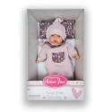 Lalka hiszpańska Petit 12440 jest ubrana w miękki wiązany na supełek pajacyk w kolorze pudrowego różu. Ubranko zdobi falbankowy kołnierzyk oraz kieszonka w motywy roślinne. Całość dopełnia słodka czapeczka z supełkiem oraz smoczek zawieszony na satynowej tasiemce. Zabawę w odgrywanie roli troskliwej opiekunki uatrakcyjnia przytulna poduszka. Wszystkie części garderoby można z łatwością zdjąć, a bobasa przebrać. Luksusu dodaje firmowe kartonowe, solidne, pięknie zaprojektowane pudełko z wieczkiem. Może ono posłużyć jako opakowanie prezentowe a następnie łóżeczko dla lali.