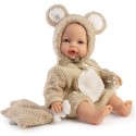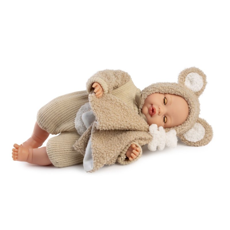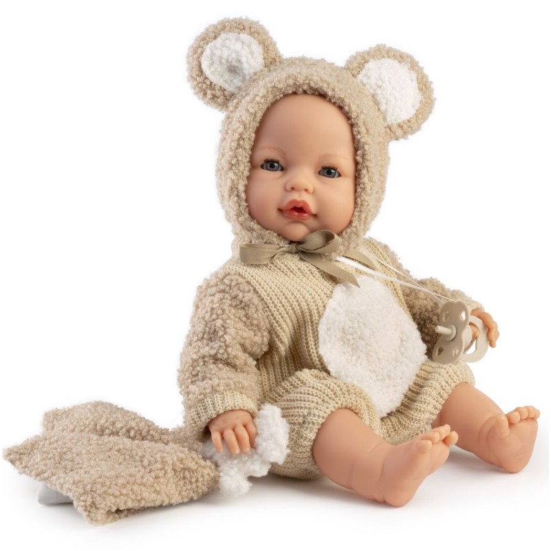 Realistycznie wyglądający, winylowy bobas z miękkim brzuszkiem posiada wyrzeźbione włoski oraz delikatnie malowane brwi, usta, paznokcie i fałdki. Wysokiej jakości piżamkę oraz wiązaną czapeczkę z łatwością można zdjąć. W komplecie znajduje się także specjalny smoczek magnetyczny na satynowej tasiemce oraz futrzany kocyk dwustronny.
