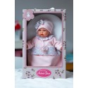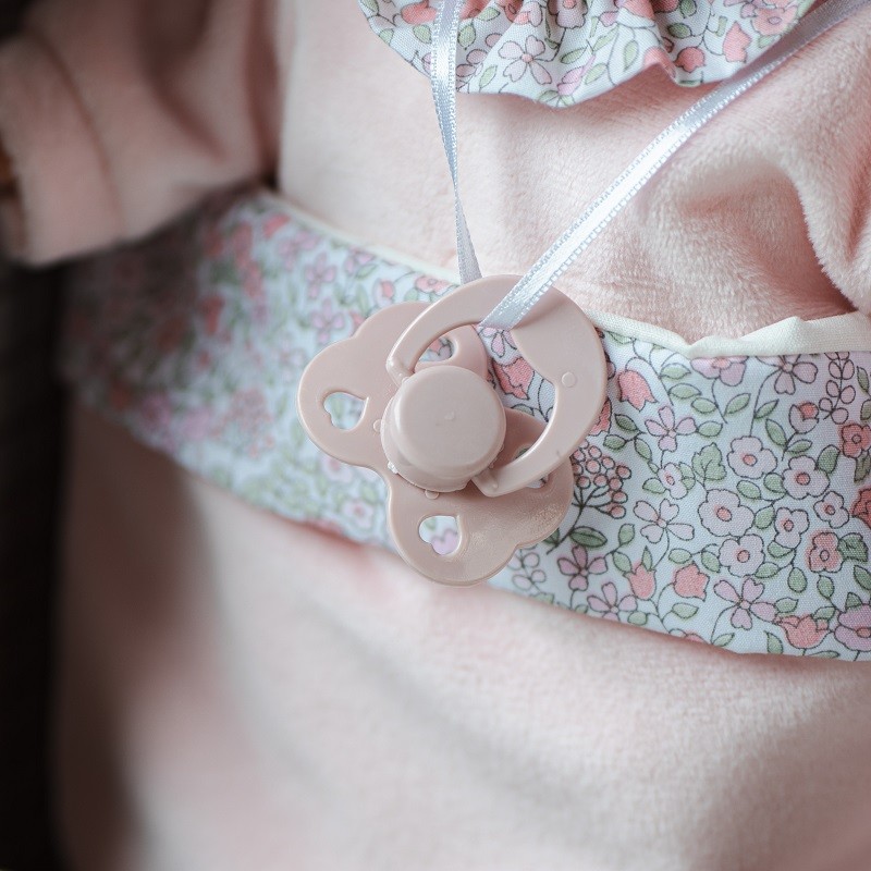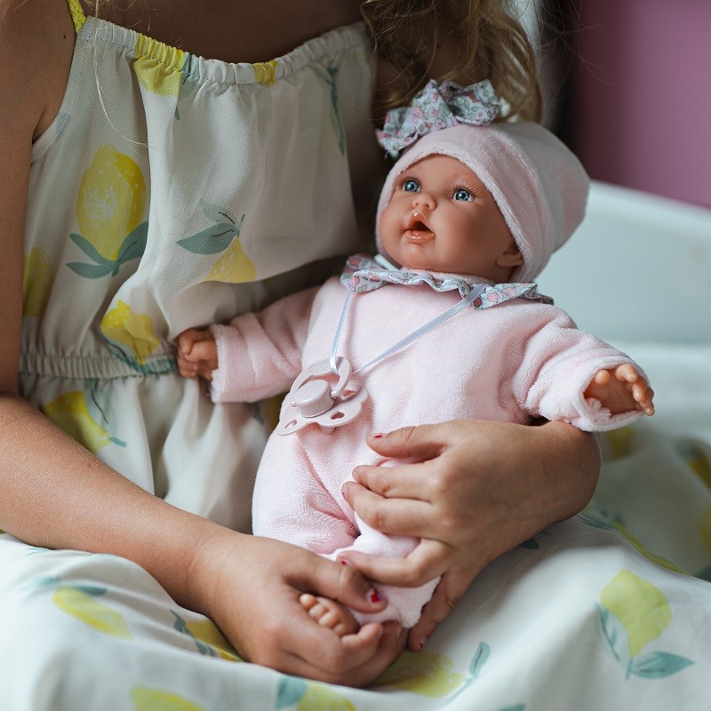 Lalka hiszpańska Petit 12443 jest ubrana w ciepłą bawełnianą, zapinaną na rzep różową piżamkę, zdobioną wzorzystą falbanką. Całość dopełnia miękka czapeczka dekorowana kokardką oraz smoczek zawieszony na satynowej tasiemce. Wszystkie części garderoby można z łatwością zdjąć, a bobasa przebrać. Luksusu dodaje firmowe kartonowe, solidne, pięknie zaprojektowane pudełko z wieczkiem. Może ono posłużyć jako opakowanie prezentowe a następnie łóżeczko dla lali.