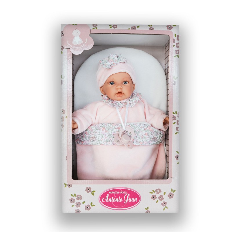 Wyjątkową, przeuroczą lalkę hiszpańską Petit cenionej marki Antonio Juan polecamy dzieciom już od drugiego roku życia. Filigranowy, 27-centymetrowy bobas waży ok. 650 g. Dzięki zastosowaniu miękkiego brzuszka świetnie nadaje się do przytulania. Główka z ręcznie wyrzeźbionymi włosami oraz ruchome kończyny wykonano z wysokiej jakości gładkiego, bezpiecznego dla dzieci winylu. Zwraca uwagę realistyczny wygląd twarzy: niebieskie oczy o głębokim spojrzeniu, malowane brwi i rzęsy, lśniące usta oraz delikatnie zaróżowione policzki. Z kolei na dłoniach i stopach są zarysowane autentycznie wyglądające paznokcie oraz linie papilarne. Atrakcyjności zabawce dodaje miękki różowy śpiworek.