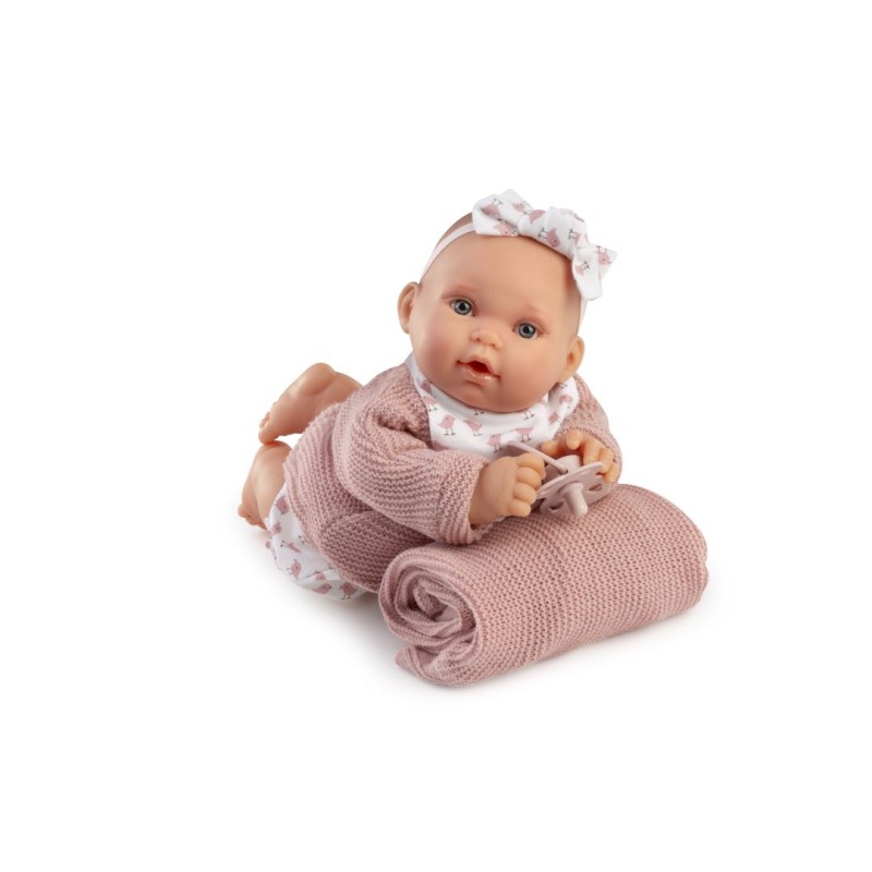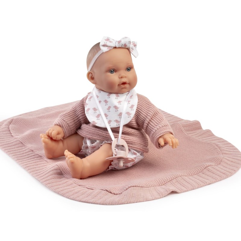 Zwraca uwagę także ręcznie szyty strój. Miękka, bawełniane spodenki z nadrukiem różowych ptaszków świetnie wyglądają w komplecie z ciepłym sweterkiem, śliniaczkiem i opaską zdobiącą główkę. W komplecie znajduje się także specjalny smoczek magnetyczny oraz kocyk.
