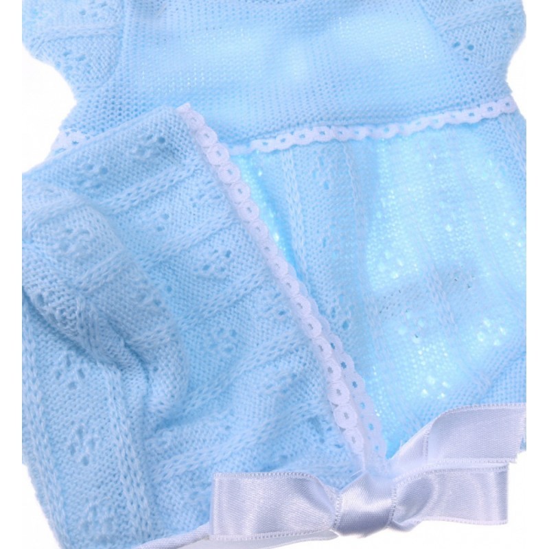 Niebieskie body z czapeczką to propozycja od marki Antonio Juan do garderoby lalki o wysokości 33 cm. W skład kompletu wchodzą zapinane na rzepę niebieskie body z krótkim rękawkiem oraz wiązana pod brodą czapeczka. Oba elementy stroju zostały wykonane z błękitnej dzianiny ze wzorkiem i obszyte koronkową wstawką.
