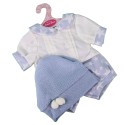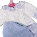 Niebieski komplet w gwiazdki to kolejny zestaw oferowany przez markę Antonio Juan, przeznaczony dla lalki o wysokości 42 cm. Komplet posiada krótki rękaw. Strój składa się z eleganckiej białej koszuli zapinanej z tyłu na rzepę oraz eleganckich bufiastych spodenek, które są gumce. Koszulę ozdabiają przyszyte guziczki oraz materiałowe zakładki umieszczone na środku ubranka. Dekorację ubranka stanowi niebieski kołnierzyk oraz mankiety z motywem w białe gwiazdki. Dodatkowo komplet wyposażono w niebieską czapkę wykonaną z dzianiny, do której przyszyte zostały dwa białe polarowe pomponiki. Dzięki posiadaniu w swojej garderobie takich dodatków kolekcja zostanie urozmaicona, a tworzone stylizacje będą coraz ciekawsze.