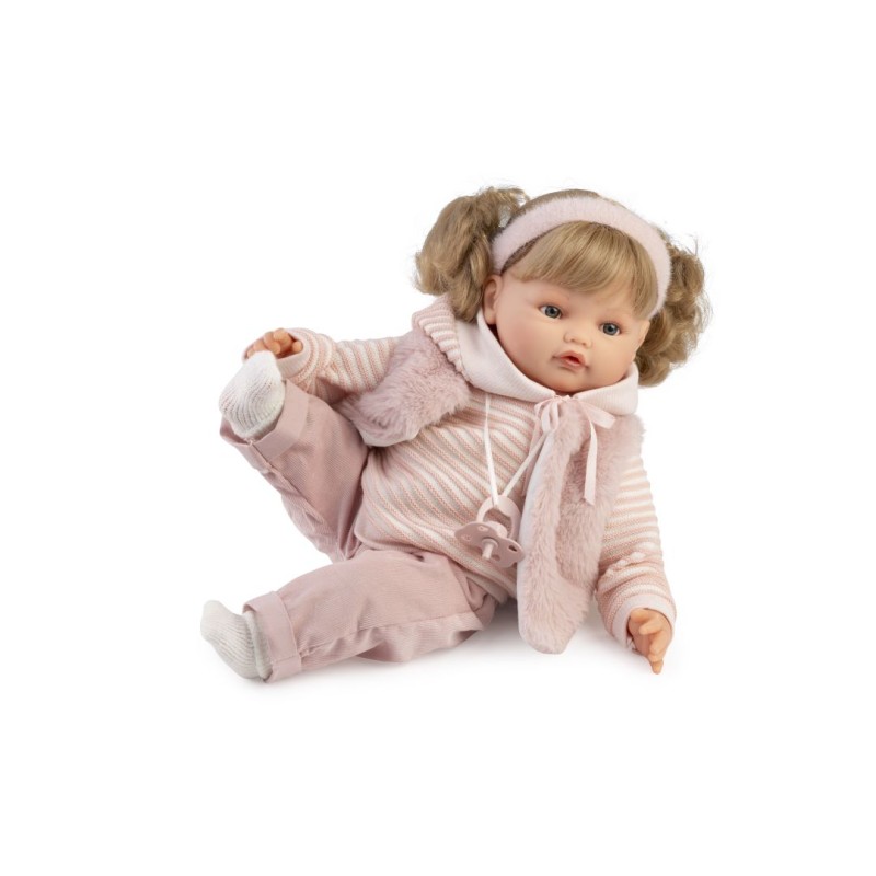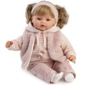 Wykonana z wysokiej jakości, przyjemnego w dotyku winylu lalka hiszpańska Antonio Juan 16386 posiada materiałowy brzuszek wypełniony miękką wyściółką. Beni ubrana jest w wysokiej jakości modny szyty ręcznie strój w delikatnych odcieniach różu, który można zdjąć: