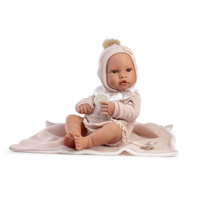 Lalka hiszpańska 50440 marki Antonio Juan to marzenie każdego dziecka, uwielbiającego zabawę w odgrywanie ról. Autentyczny wygląd pozwala z łatwością wcielić się w rolę troskliwego rodzica. Erika ubrana jest w oryginalnie zaprojektowany outfit: teksturalny sweterek z kołnierzykiem, miękkie krótkie spodenki oraz ciepłą czapeczkę z puszystym pomponem. Strój z łatwością można zdjąć, a bobasa przebrać lub wykąpać. W zestawie także dwustronny kocyk oraz smoczek przypinany na łańcuszku.