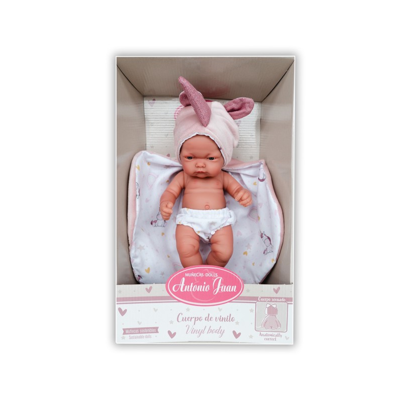 Lalka została zapakowana w kartonowe pudełko, na którym widnieje oryginale logo hiszpańskiej marki Antonio Juan. Co więcej, tak skomponowana laleczka to wspaniały produkt jako zakup pierwszej laleczki czy doskonała opcja na prezent. Dzięki pięknemu kartonowi nie musisz martwić się o dodatkowe opakowanie ozdobne, gdyż sam w sobie karton prezentuje się doskonale.