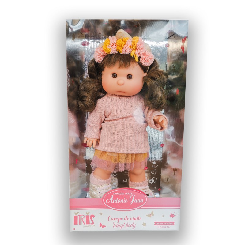 Z uroczymi rysami twarzy Iris 23102 jest pierwszą lalką - manekinem, która przyniesie każdego do magicznego świata. To hitowy model z najnowszej kolekcji hiszpańskiej marki Antonio Juan. Iris jest uroczą brunetką o średniej wysokości, gdyż ma 38 cm wzrostu i waży 1,23 kg. Na ślicznej buźce dziewczynki widoczne są zaróżowione policzki, okrągły nosek oraz głęboko osadzone, błyszczące usta. Iris ma duże, brązowe oczka, nie posiada rzęs ani brwi. Dziewczynka ma długie, pofalowane włosy z grzywką. Dodatkowo fryzurę dziewczynki ozdabia świetna, wiązana opaska z motywem jednorożca. Iris nie posiada zaznaczonej płci i jest dedykowany do zabawy dla dzieci od 3 roku życia.