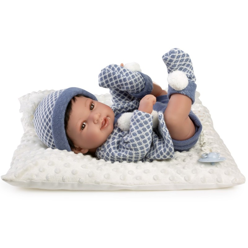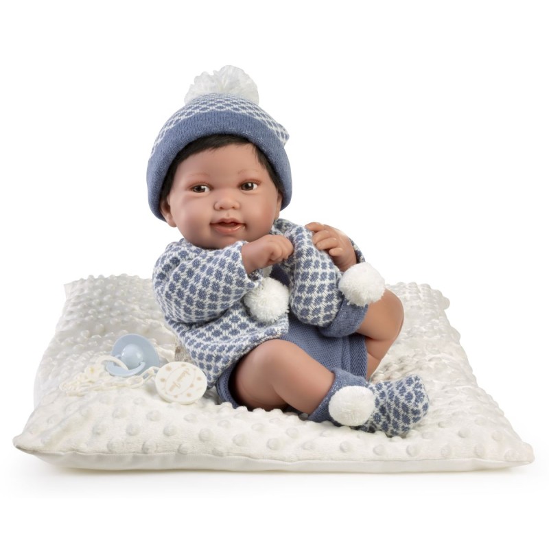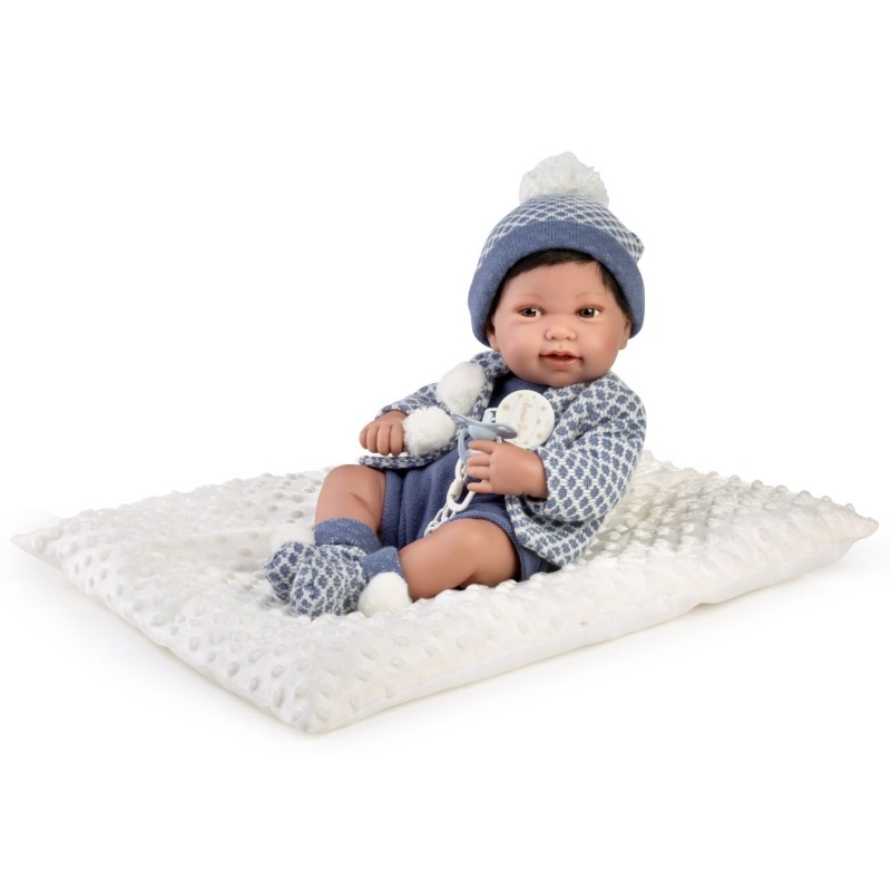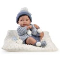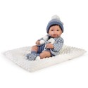 Urodę bobasa podkreśla jego stylowy, szyty ręcznie ubiór. Chłopiec ma na sobie niebieskie body z krótkim rękawem, wykonane z dzianiny oraz sweterek w kratkę. Do zestawu dołączone są: czapka oraz skarpetki z pomponami. Ubranka można zdjąć, a lalę przebrać lub wykąpać.
