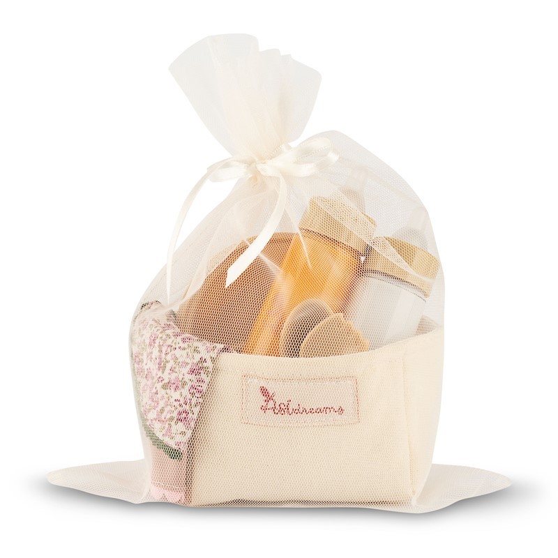 Zaprojektowany dla bobasów o wymiarach od 36 do 46 cm, zestaw akcesoriów do karmienia lalek zawiera: talerzyk, sztućce, dwa śliniaczki z różnymi nadrukami oraz dwie magiczne buteleczki: jedną z "sokiem" i jedną z "mlekiem". Wszystko znajduje się w materiałowym jasnobeżowym koszyczku, który z kolei jest zapakowany w tiulowy woreczek prezentowy. Zabawka została zaprojektowana i wyprodukowana w Hiszpanii.