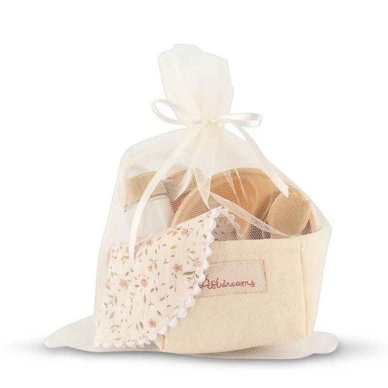 Zaprojektowany dla bobasów o wymiarach od 36 do 46 cm, zestaw akcesoriów hiszpańskiej marki ASI do karmienia lalek zawiera: talerzyk, sztućce, dwa śliniaczki z różnymi nadrukami oraz dwie magiczne buteleczki: jedną z "sokiem" i jedną z "mlekiem". Wszystko znajduje się w materiałowym jasnobeżowym koszyczku, który z kolei jest zapakowany w tiulowy woreczek prezentowy. Zabawka została zaprojektowana i wyprodukowana w Hiszpanii.