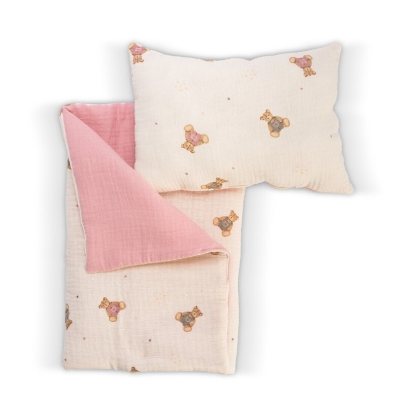 Komplet zdobiony jest z jednej strony słodkimi misiami, z drugiej natomiast urzeka tkaniną w modnym delikatnym różu. Akcesorium z kolekcji hiszpańskiej cenionej marki Asi zapakowane jest w tiulową torebkę, dekorowaną lśniącą satynową kokardką. Świetnie sprawdzi się jako prezent dla dziecka w wieku od 3 lat.