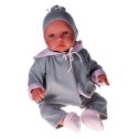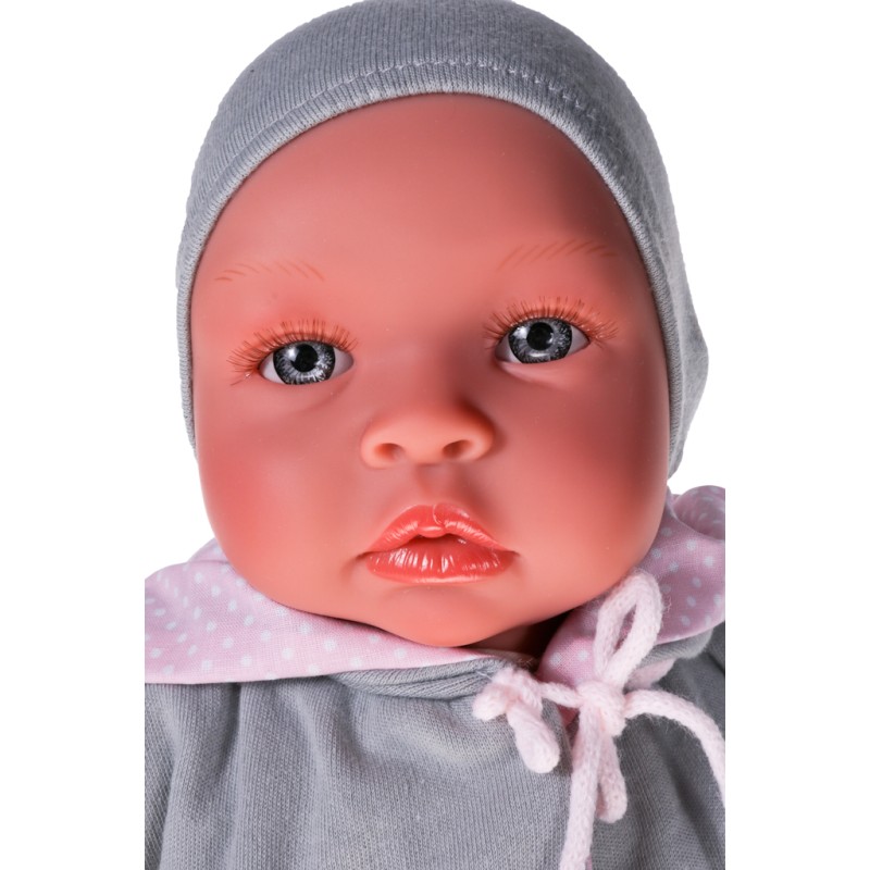 Strój lali sprawia, że nasza pociecha może zabrać ją ze sobą na spacer do parku czy do przedszkola także w chłodniejszy dzień. Bobas ubrany jest w szary komplecik - spodenki na gumce oraz zawiązywaną bluzę z kapturem. Kurtkę można przewrócić na drugą stronę, która ma inny kolor, jest różowa w białe groszki. Nasza pociecha z dwustronną górą ma więcej możliwości ubioru. Strój uzupełnia szara czapka z falbanką w kolorze dresów, a także różowe skarpetki z włóczki. Ubrania dziewczynki można zdjąć, aby umilić zabawę i nabrać wprawy w przebieraniu pociechy. Dziecko może troszczyć się o swoje maleństwo i wszędzie je ze sobą zabrać, by poczuć się jak prawdziwa mama.