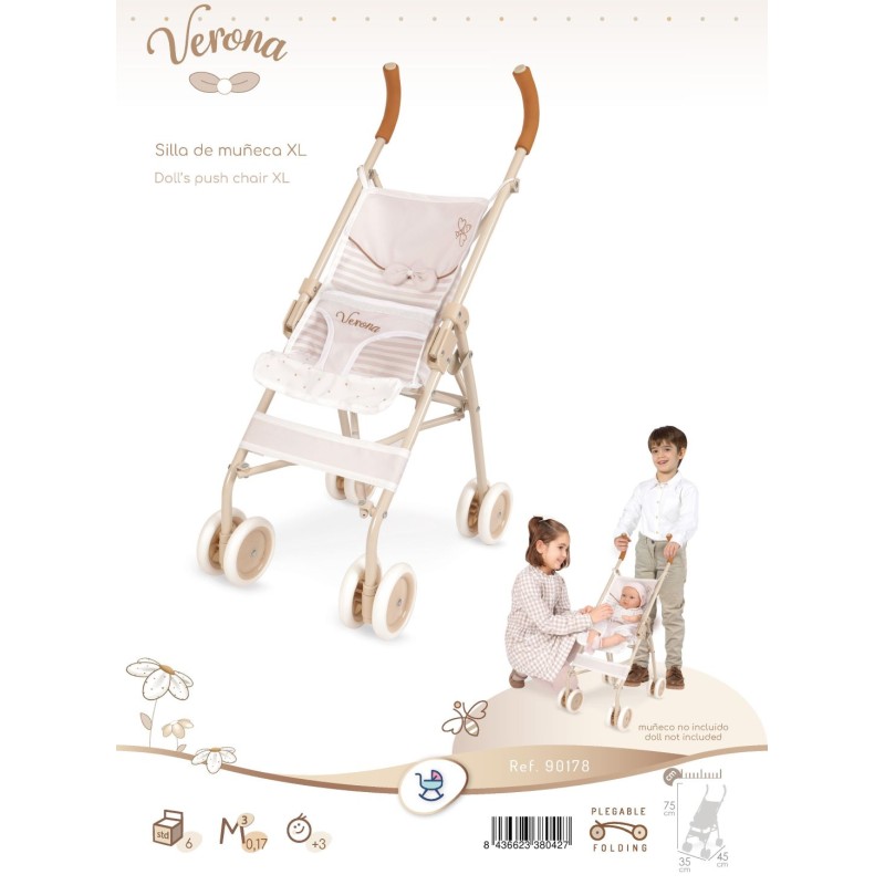 Każda kolekcja lalek staje się atrakcyjniejsza i zachęca do aktywnej zabawy w domu i na świeżym powietrzu jeśli wzbogacimy ją o oryginalne i funkcjonalne akcesoria. Stylowo zaprojektowany, duży wózek dla lalki dodatkowo dodaje niepowtarzalny akcent wnętrzu pokoju dziecięcego. Kolekcja Verona znanej hiszpańskiej marki DeCuevas została zainspirowana Weroną, kojarzoną z historią miłosną z „Romeo i Julia” Williama Szekspira. Wyróżnia się delikatnymi odcieniami beżu i brązu. wiosennymi detalami, takimi jak kwiaty i pszczółki, a także subtelnymi i uniwersalnymi zdobieniami. Dziecko może zabrać lalę o wysokości do 52 cm na spacer lub na wycieczkę. Lekki, składany model jest łatwy w transporcie i wygodny w użytkowaniu. Polecamy maluchom w wieku od 3 lat.