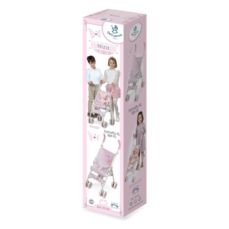 Każda kolekcja lalek staje się atrakcyjniejsza i zachęca do aktywnej zabawy w domu i na świeżym powietrzu jeśli wzbogacimy ją o oryginalne i funkcjonalne akcesoria. Stylowo zaprojektowany, duży wózek spacerówka dla lalki dodatkowo dodaje niepowtarzalny akcent wnętrzu pokoju dziecięcego. Model 90146 to jedyna w swoim rodzaju propozycja z pięknej kolekcji Niza od renomowanej hiszpańskiej marki DeCuevas. Została ona zainspirowana malowniczą francuską miejscowością - Niceą, stolicą Lazurowego Wybrzeża. Wyróżnia się delikatną biało-różową kolorystyką oraz ponadczasowym wzorem w kratkę. Dziecko może zabrać lalę o wysokości do 48 cm na spacer lub na wycieczkę. Lekki, składany model jest łatwy w transporcie i wygodny w użytkowaniu. Polecamy maluchom w wieku od 3 lat.