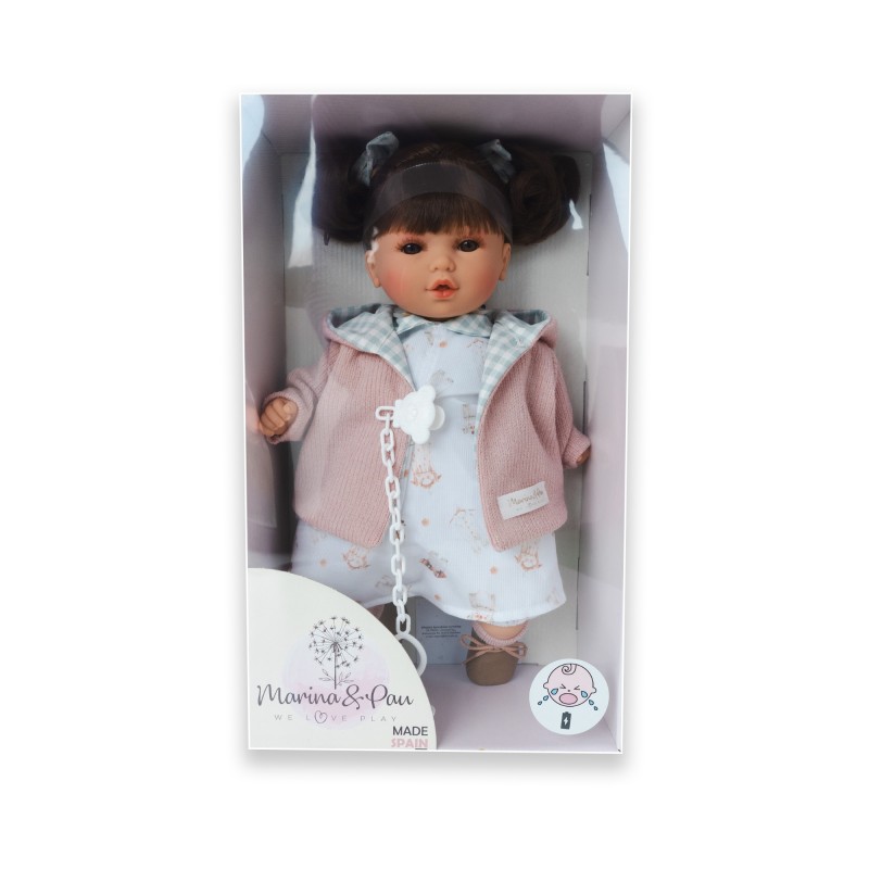 Śliczna 40-cm dziewczynka to gwarancja świetnej zabawy. Ubrana we wzorzystą bawełnianą sukienkę z kołnierzykiem oraz dwustronną, miękką bluzę z kapturem, to wyjątkowa wersja popularnej funkcyjnej lalki hiszpańskiej o imieniu Petite. Została ona zaprojektowana i ręcznie wykonana w Hiszpanii w firmie Marina & Pau. W komplecie znajduje się smoczek, skarpetki i buciki.