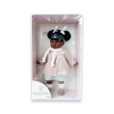 Idealna do zabawy w odgrywanie roli troskliwej opiekunki, lalka hiszpańska Tina zachwyca gęstymi, miękkimi, lekko kręconymi czarnymi włosami, zebranymi za pomocą białych polarowych wstążeczek oraz ręcznie malowanymi brązowymi oczami, opatrzonymi wianuszkiem rzęs oraz delikatnie zarysowanymi brwiami. Lśniące usteczka oraz rumieńce na policzkach dodają twarzy pogodnego wyrazu.