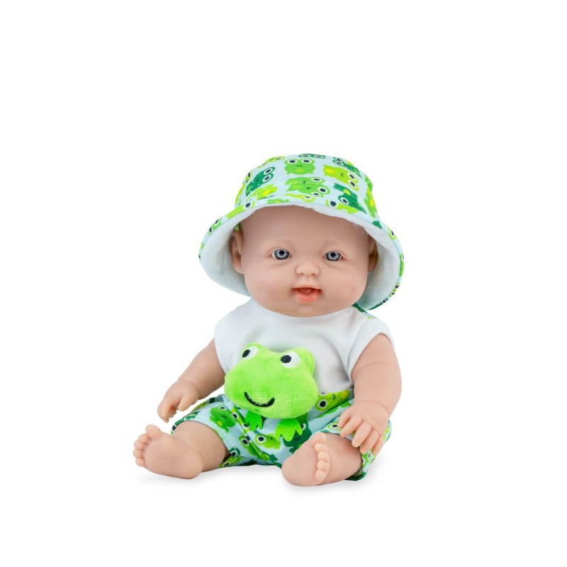 Niewielki, 28 cm, radosny bobas w ślicznym stroju w zielone żabki to jedyna w swoim rodzaju wersja popularnego modelu Cuco, zaprojektowanego i ręcznie wykonanego w Hiszpanii w firmie Marina & Pau. Przyciąga wzrok uśmiechnięty wyraz twarzy, wyrzeźbione na główce włoski niemowlęce oraz jasnoniebieskie, ręcznie malowane otwarte oczy. Podkreślone rysy twarzy, wyrzeźbione linie papilarne, dołeczki na piąstkach czy fałdki pod kolanami sprawiają, że bobas wygląda jak żywy. Chłopiec został wykonany z gładkiego, przyjemnego w dotyku, bezpiecznego winylu. Ma zaznaczoną płeć. Polecany dla dzieci w wieku od 3 lat, świetnie sprawdza się także podczas zabawy w kąpieli. Nie posiada włosów ani rzęs, brwi są lekko zaznaczone. Ruchome rączki, nóżki oraz główka sprawiają, że można ułożyć lalę w różnych pozycjach. Cuco siedzi samodzielnie.