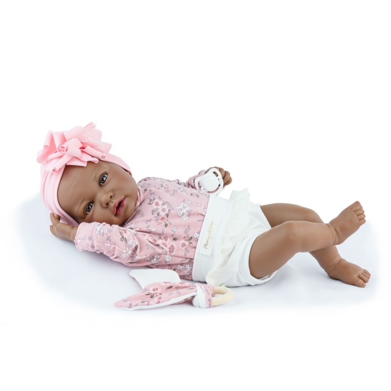 Przepiękna, czarnoskóra dziewczynka o imieniu Gala to wyjątkowy, 45-cm. bobas z kolekcji ekskluzywnych lalek hiszpańskich cenionej marki Marina & Pau. Posiada duże, brązowe oczy wyglądające jak prawdziwe, a ich oprawa została podkreślona gęstym wianuszkiem rzęs oraz delikatnym zarysem ręcznie malowanych brwi. Model 1234 ma skrupulatnie wyrzeźbione włoski na przyciemnionej główce. Miękki brzuszek w kolorze skóry sprawia, że lalka świetnie nadaje się do przytulania. Niewątpliwym atutem jest też wysokiej jakości, bawełniany, ręcznie szyty strój w typowo dziewczęcej wersji. Uroku dodaje stylowa różowa opaska na główkę. W zestawie także smoczek oraz gryzak. Zabawkę proponujemy dzieciom w wieku od 3 lat.
