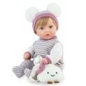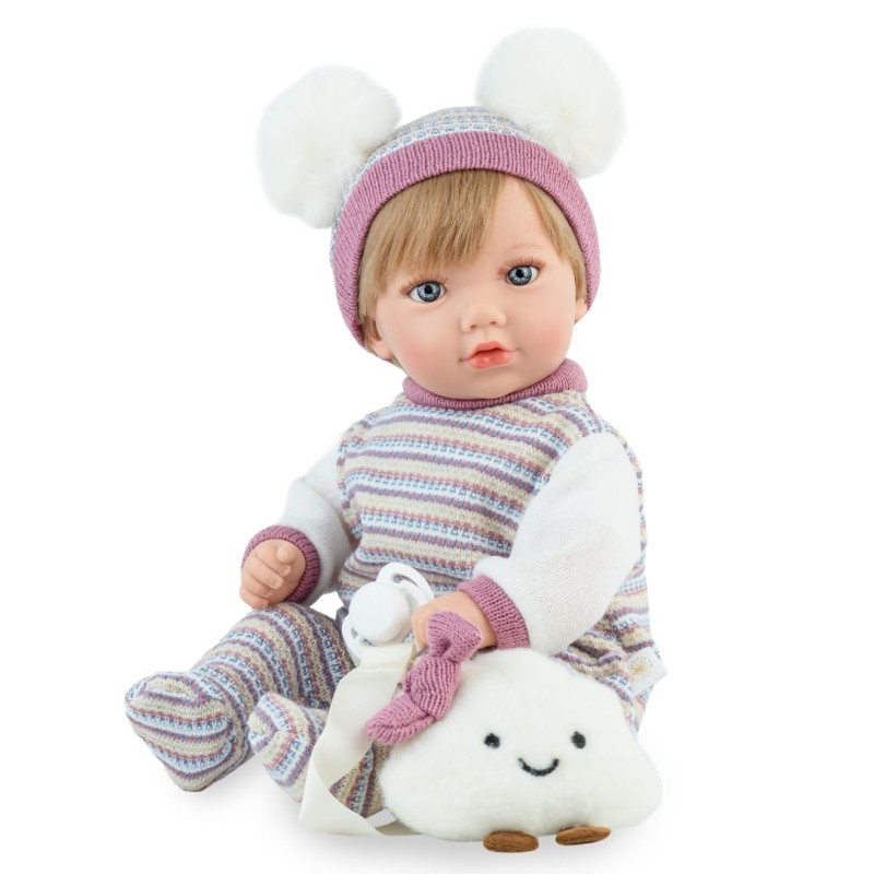 Pachnąca wanilią, ślicznie ubrana lalka hiszpańska o imieniu Noa doskonale wpisuje się w asortyment cenionej marki Marina & Pau, znanej z łączenia pasji, tradycji i innowacyjności. 40-centymetrowy bobas o wadze ok. 500 g wygląda jak prawdziwa mała dziewczynka z krótkimi blond włosami do czesania. W zestawie znajduje się maskotka: pluszowa biała chmurka oraz smoczek z klipsem. Dzięki zastosowaniu miękkiego, materiałowego brzuszka lalka jest świetna także jako przytulanka. Z kolei głowę i kończyny wykonano z wysokiej jakości gładkiego, przyjemnego w dotyku jasnego winylu. Mięciutka lala nie siedzi samodzielnie, ale można ją oprzeć o jakiś przedmiot lub ułożyć w spacerówce.