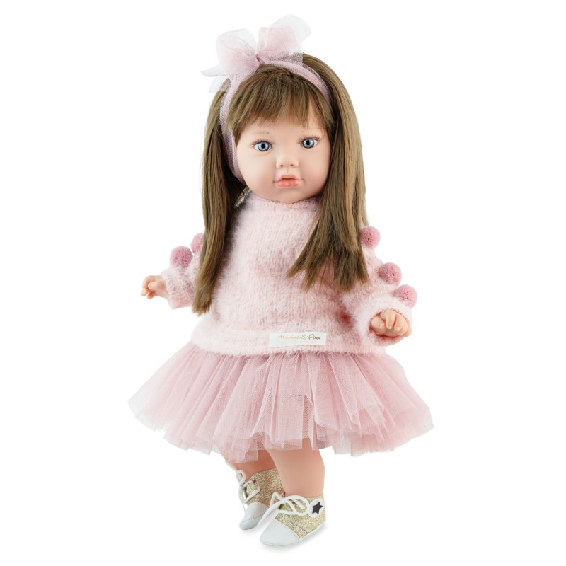 Stylowo ubrana lalka hiszpańska MP764 doskonale wpisuje się w asortyment cenionej marki Marina & Pau, znanej z łączenia pasji, tradycji i innowacyjności. 45-centymetrowa Alina wygląda jak prawdziwa dziewczynka z długimi, gęstymi brązowymi włosami, idealnymi do czesania i projektowania oryginalnych fryzur. Dzięki zastosowaniu miękkiego, materiałowego brzuszka lalka jest świetna także jako przytulanka. Z kolei głowę i kończyny wykonano z wysokiej jakości gładkiego, przyjemnego w dotyku jasnego winylu.